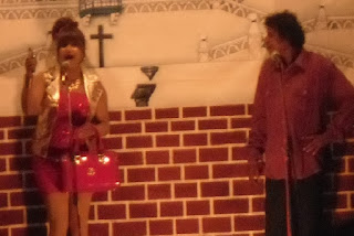 In the Side Show songs, everything went on very well as almost all the songs were very good whether solos or duos or duets or trios. Among all the singers, the beauty of Konkani Stage Olga stole the whole show by rendering a beautiful solo based on current Goan politics and politicians. She carries the credit for being the first female to sing such highly political songs. She even outpaced her male counterparts in this area. She got innumerable encores even to the extent of forcing the director to stop the play and to allow her to sing as per the last encore. When she was singing the whole Hall in unison was vibrating with clapping and whistling. Such encores never before I saw for any female artiste except for M. Boyer who incidentally falls into male category. Precisely because of this she was honoured on the stage with a Memento. Her duet with her husband Anil was very good also. Just like her looks her dress code too was very attractive for this duet.